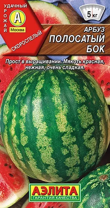 Арбуз 'Полосатый Бок' – это сорт раннего срока созревания, характеризующийся периодом от полных всходов до достижения съемной спелости в пределах 65-83 дней. Растение плетистое, с главной плетью умеренной длины. Плоды имеют округлую форму, гладкую поверхность и достигают массы 3-6 кг. Основной фон коры – светло-зеленый, украшенный темно-зелеными полосами средней ширины. Кора тонкая. Мякоть красная, нежная и обладает исключительной сладостью. Собранные плоды сохраняют свои товарные качества на протяжении 20-30 дней. Сорт отличается устойчивостью к болезням.