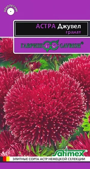 Астра «Джувел гранат» отличается огромными, до 14 см в диаметре, соцветиями игольчато-коготковой формы, которые образуют практически шаровидные соцветия насыщенного бардового оттенка. Растение пирамидальной формы высотой 65-75 см формирует до 10 таких соцветий на прочных цветоносах, что обеспечивает ему превосходные срезочные качества.