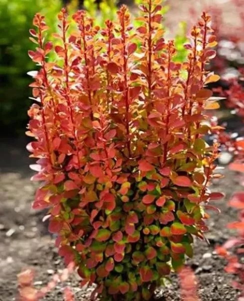 Барбарис тунберга «Оранж Рокет» — это колонновидный кустарник высотой до 1,2 метра, особенно ценимый в ландшафтном дизайне за свою яркую окраску и строгую форму. Молодые побеги имеют насыщенный оранжевый цвет, который с возрастом сменяется на тёмно-красный, сохраняя декоративность весь сезон.