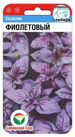 Фиолетовый базилик – однолетнее пряно-ароматическое растение высотой 30-35 см с темно-фиолетовой листвой и выраженным вкусом, напоминающим душистый перец. Отличается быстрым отрастанием после срезки. Обладает лечебными свойствами: дезинфицирующим и мочегонным действием, снимает спазмы желудка, укрепляет нервную систему, тонизирует и улучшает пищеварение, особенно жиров. Предпочитает лёгкие, плодородные, хорошо дренированные почвы, не выносит застоя воды и затенения. Урожай собирают до и после цветения. Используется как свежая, так и сушёная приправа в кулинарии (блюда, соусы), а также для приготовления ароматизированного уксуса и других напитков. Размножается посевом семян в грунт или через рассаду