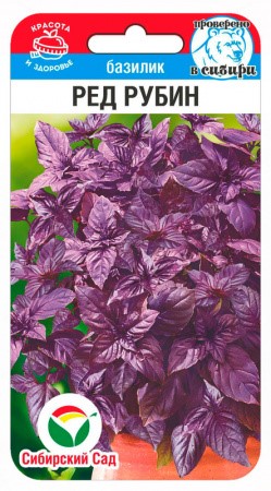 Среднеспелый (65-70 дней) высокоурожайный базилик "Ред Рубин" — декоративное растение с яркой фиолетовой окраской листьев и стеблей, и выраженным пряно-гвоздичным ароматом. Подходит для выращивания в открытом грунте по всей России. Компактный куст (30-50 см высотой, 180-250 г массой) с глянцевыми, ярко-фиолетовыми, слабоволнистыми листьями и темно-фиолетовыми соцветиями. Используется как ароматная пряность в свежем и сушеном виде в кулинарии и консервировании. Урожайность: 2,0-2,5 кг/м²