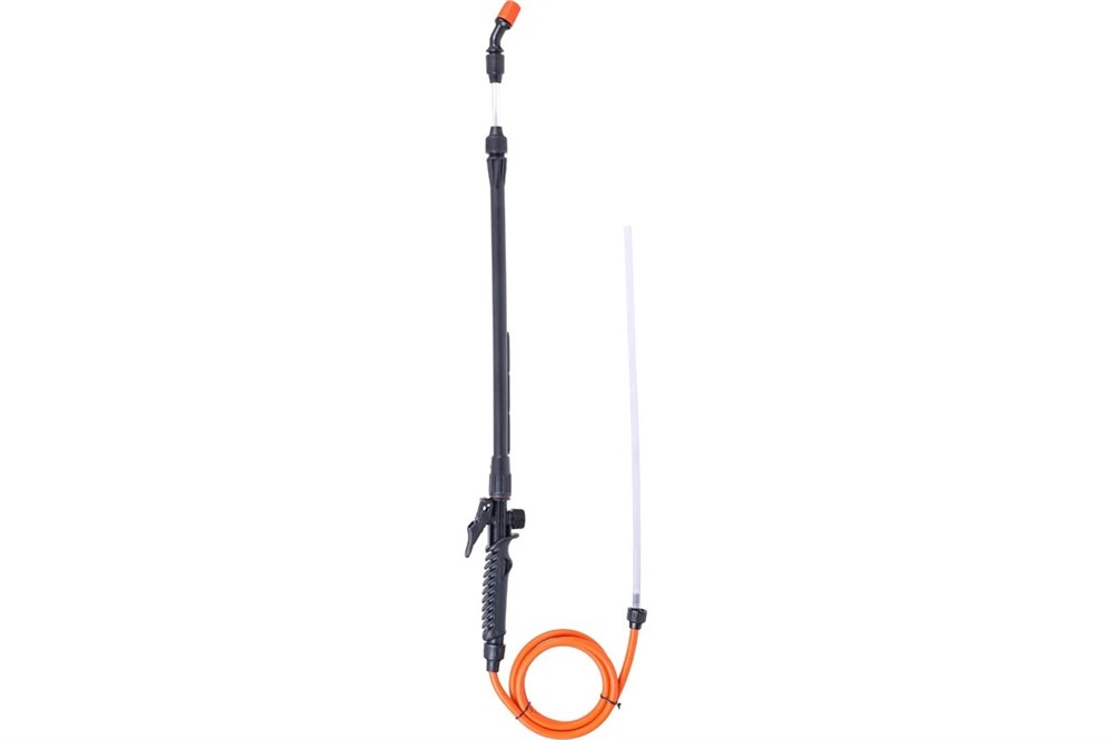 Удобная ручка, гибкий шланг и регулируемый распылительный узел на конце делают процесс обработки комфортным и контролируемым. Телескопическая конструкция позволяет легко менять длину инструмента для доступа к высоким деревьям или нижним ярусам кустарников