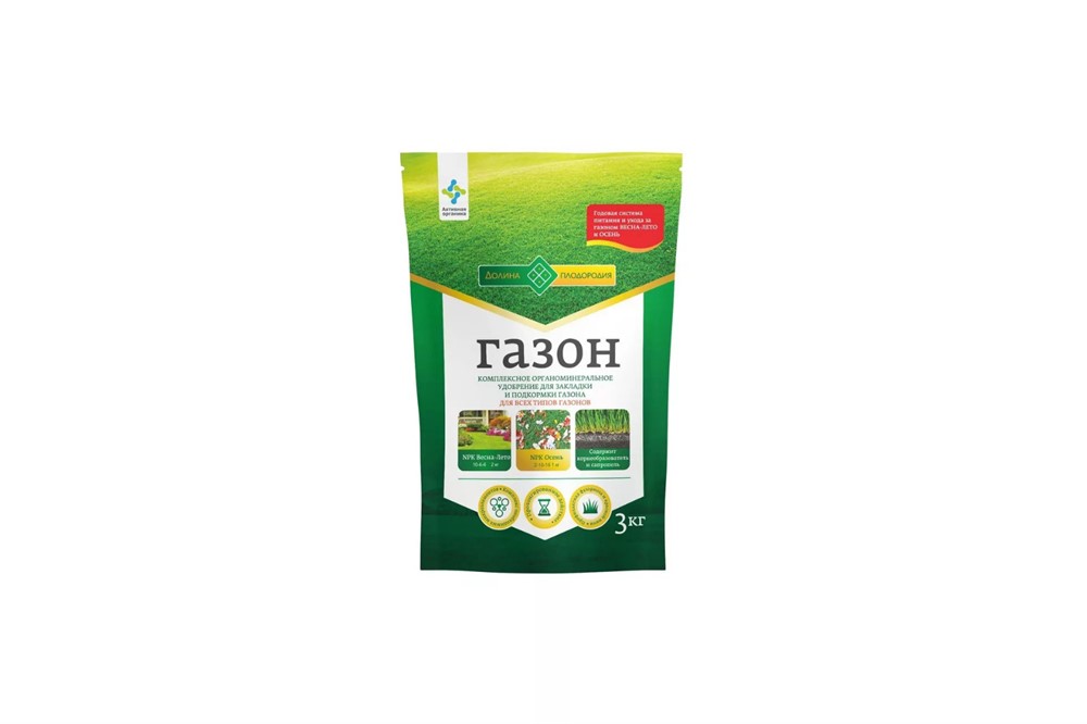 Комплексное гранулированное органоминеральное удобрение пролонгированного действия для различных типов газонов. Содержит специальные комплексы для подкормки газонов в период весна-лето и для осенней подкормки газонов. В составе удобрения содержатся макро-и микроэлементы в сбалансированном состоянии и в легкоусвояемой форме для растений. Гуминовые соединения способствуют полноценному развитию газона, сохранению устойчивого зеленого цвета травы на весь период вегетации. Окутав гранулы корешками, травы потребляют минеральные элементы постепенно. В органоминеральных соединениях усвоение полезных веществ возрастает до 98%. Они сохраняются в почве длительное время, продолжая свое действие два года. Обеспечивает перезимовку и хорошую сохранность газона. Длительное действие удобрения обеспечивает яркую зеленую окраску газона, густоту травяного покрова на протяжении теплого сезона и укрепляет иммунитет ко многим болезням.