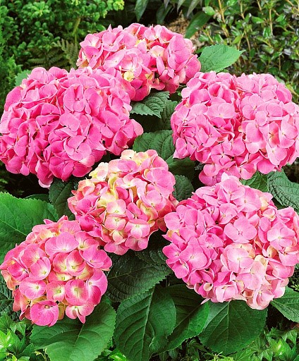 Гортензия крупнолистая Радость удивит вас нежно-розовыми со сливочным оттенком цветами, которые сами по себе достаточно крупные и образуют большие шаровидные соцветия, способные достигать в диаметре 17 см. Цветет этот сорт с июля по август, но при обрезке уже отцветших соцветий, прекрасные цветы будут радовать вас до самых заморозков. У этого сорта также очень темные листья, изысканно обрамляющие цветущие сферы и создающие для них прекрасный фон. Стоит помнить, что крупнолистные гортензии, не смотря на работу селекционеров по выведению зимостойких видов, требуют укрытия на зиму. А поскольку цветущие почки закладываются на 3-4 узле от основания куста, то укрывать нужно повыше.