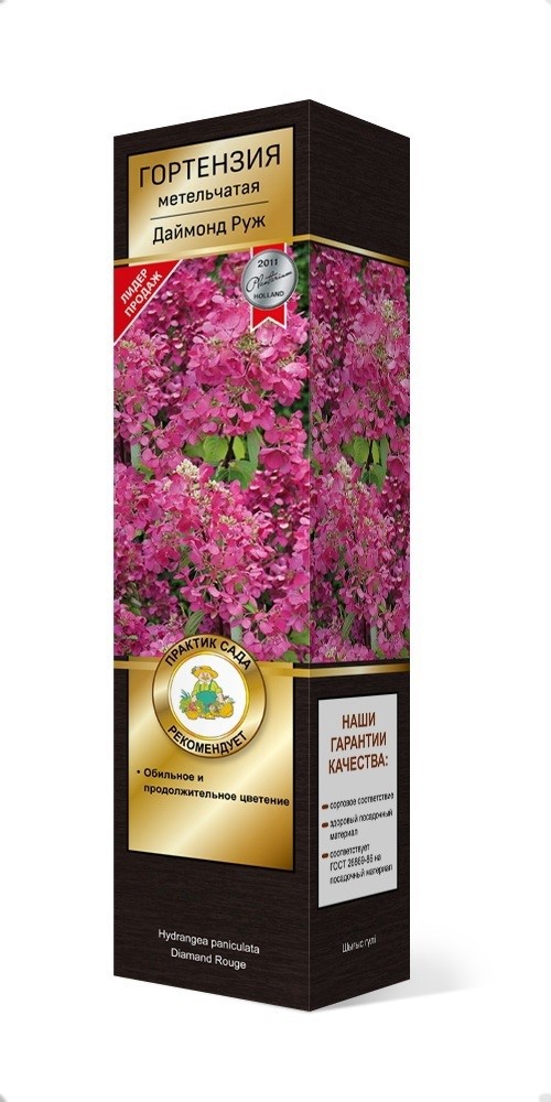Гортензия Даймонд Руж (Алмазно-Красный) метельчатая - Этот сорт настоящая инновация, самый красный сорт из всех известных сортов гортензии метельчатой. Он ослепляет насыщенным красным цветом и крупными пышными соцветиями, до 30-40 см длиной, состоящими из стерильных цветков. Раскидистый кустарник высотой до 1,5 м. Соцветия крупные, 30-35 см в длину. Цветет начиная с июня и до октября. Зацветает уже в год посадки. Вынослива и неприхотлива. Зимует без укрытия, но молодые растения рекомендуется мульчировать на зиму.