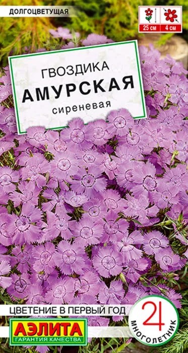Гвоздика амурская Сиреневая – многолетнее травянистое растение, формирующее компактные кустики высотой 20-25 см, усыпанные сиренево-розовыми цветками 3-4 см в диаметре. Отличается обильным цветением в течение всего летнего сезона и приятным ароматом.