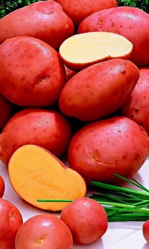 Кусты этого сорта имеют среднюю высоту и отличаются устойчивостью к полеганию. С одного куста можно собрать от 8 до 13 картофелин. Полная спелость наступает через 65-70 дней после посадки, а молодую картошку можно начинать выкапывать уже через 45 дней. Вес одного клубня составляет 100-150 г. Клубни имеют розовую или почти красную кожуру и жёлтую мякоть. Содержание крахмала невысокое – 11-15 %, развариваемость низкая, картофель сохраняет форму после варки и обладает приятным вкусом