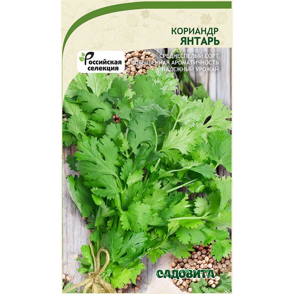 Кориандр Янтарь – среднеспелый, высокоурожайный сорт с периодом от всходов до уборки 30-40 дней. Растения достигают высоты 30-55 см и формируют полураскидистую листовую розетку. Листья темно-зеленые, нежные и ароматные. Сорт является отличным медоносом. Семена используют как пряную приправу для ароматизации хлебобулочных и кондитерских изделий, а также в маринадах, в то время как молодые листья применяются в кулинарии