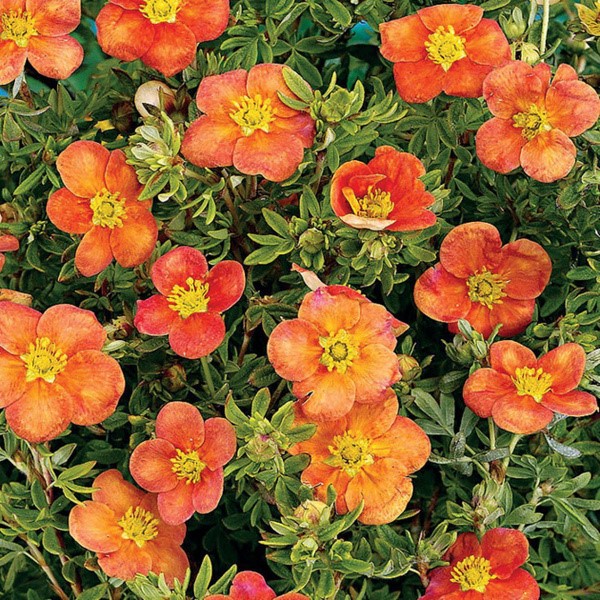 Довольно компактный сорт, высота растения может достигать 1 м, но, как правило, не превышает 50-80 см. Крона плотная, подушковидная, диаметром до 130 см. Листья перистые, зеленые, желтеющие осенью. Цветет обильно с июня до октября довольно крупными, диаметром от 3 до 5 см, ярко-оранжевыми цветами, украшенными пушистыми желтыми тычинками. Купить саженцы лапчатки кустарниковой Хоплес Оранж стоит для украшения цветников и миксбордеров, оформления каменистых садов, создания привлекательных бордюров. Лапчатка красиво смотрится в одиночной посадке на фоне газона и поможет украсить растительную композицию с хвойниками, декоративными кустарниками, многолетними цветами. Растение морозостойко, устойчиво к засухе, обладает крепким иммунитетом, нетребовательно к составу почвы. Для посадки подойдет солнечный участок или полутень с рыхлым, дренированным грунтом. В период засухи нуждается в регулярном поливе, формующую обрезку рекомендуется проводить весной