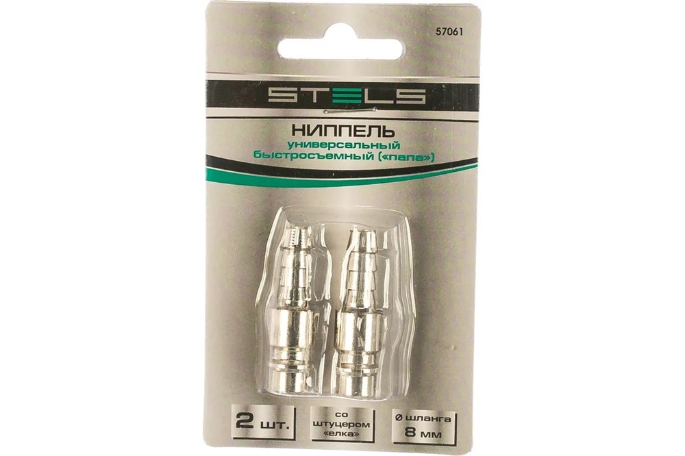 Универсальный быстросъемный ниппель Stels 57061 со штуцером «ёлка» является ключевым адаптером для подключения пневматического шланга диаметром 8 мм к компрессорной линии. Он обеспечивает совместимость шланга со стандартным быстроразъемным соединением типа «папа» размером 1/4 дюйма.
