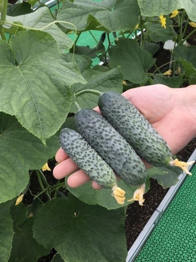 Крупнобугорчатые темно-зеленые плоды длиной 10-12 см отличаются плотной структурой без пустот и приятным сладковатым вкусом без малейшей горечи. Гибрид стабильно дает до 13,4 кг с квадратного метра, устойчив к болезням и идеально подходит как для свежих салатов, так и для любых видов консервации