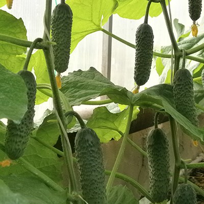 Плоды – зеленцы длиной 9-11 см и массой 90-100 г – отличаются крупнобугорчатой поверхностью, бурыми шипами и полным отсутствием горечи. Они имеют темно-зеленую окраску со светлыми полосами. В каждом листовом узле формируется по 1-2 завязи, обеспечивая стабильное плодоношение.