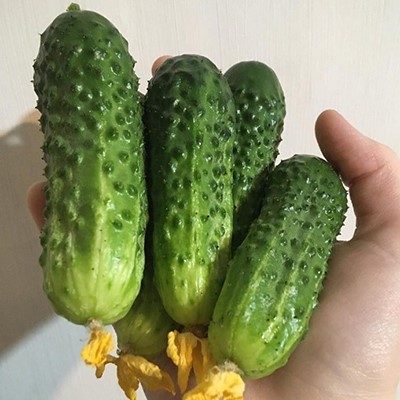 Плоды короткие, овальной формы, насыщенно-зеленые с короткими светлыми полосками. Их поверхность крупнобугорчатая, слегка ребристая, с белым опушением. Масса каждого зеленца составляет 80-100 г. Сорт отличается отличным вкусом: огурцы хрустящие, сочные и полностью лишены горечи.