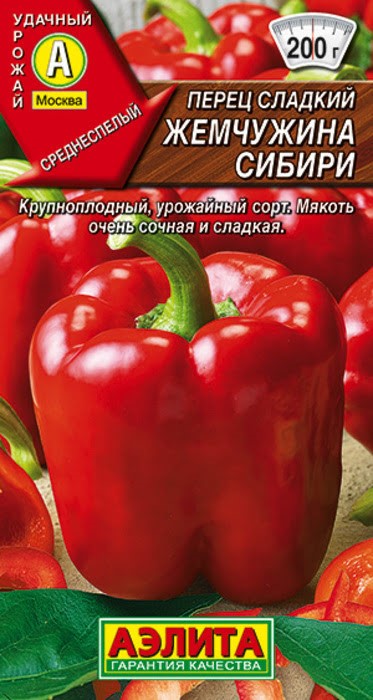 Сладкий перец "Жемчужина Сибири" – среднеспелый сорт, подходящий для открытого и закрытого грунта. Плодоносит через 120-130 дней после всходов. Растения компактные (60-70 см) с кубовидными плодами. Перцы крупные (около 200 г), толстостенные (7-8 мм), с сочной, хрустящей и ароматной мякотью. Универсален в использовании: свежий, в кулинарии и заготовках. Урожайность в теплице – 5-6 кг/м². Устойчив к болезням и непогоде.