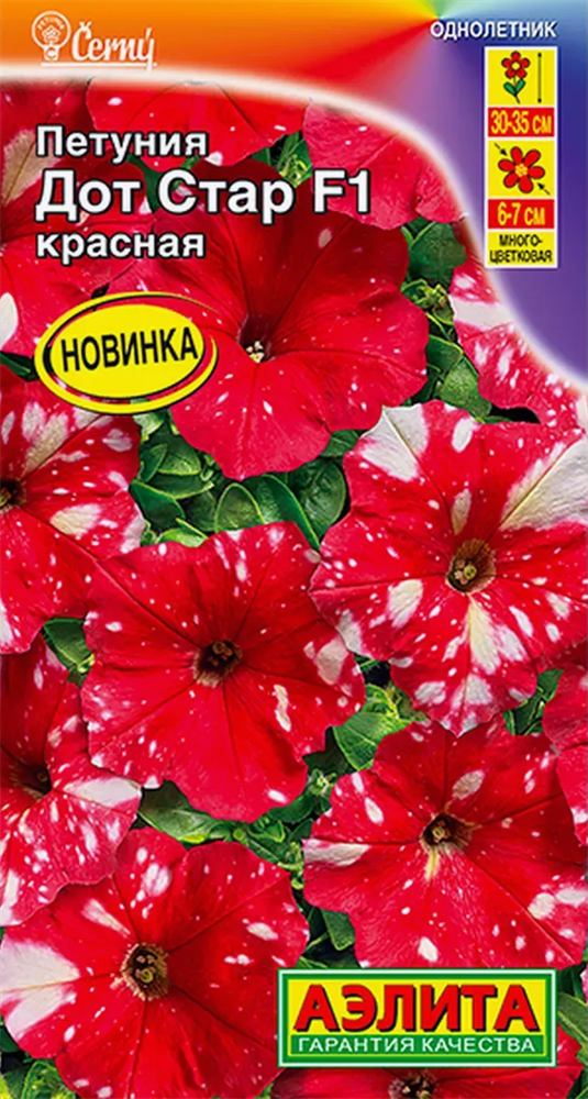 Это эксклюзивная петуния чешской селекции, одна из самых популярных расцветок. Серия гибридов «Дот Стар» представляет собой многоцветковую петунию с потрясающим контрастным рисунком лепестков, который напоминает звёздное небо. Каждый цветок уникален: форма и количество белых вкраплений меняются в зависимости от погодных условий. Высота растений составляет 30–35 см. Они активно растут и развиваются, образуя симпатичные плотные кустики с большим количеством цветков диаметром 6–7 см. Эта яркая петуния украсит любую клумбу, вазон или подвесное кашпо, став настоящей изюминкой вашего сада! Семена представлены в виде гранул. Их нужно расположить на поверхности почвы, не заделывая вглубь, и хорошо увлажнить из распылителя. Когда гранулы намокнут, оболочка растворится. После этого посевы следует накрыть стеклом, чтобы сохранить постоянную влажность до появления всходов. Февральским посевам потребуется дополнительная подсветка.