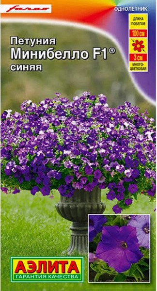 Петуния «Минибелло F1 синяя» от фирмы «Аэлита» — гибрид итальянской селекции (Farao), чьё невероятно обильное и долгое цветение сравнимо с калибрахоа. Растение, благодаря гену мужской стерильности, непрерывно усыпано мелкими цветками с весны до поздней осени. Его активно ветвящиеся каскадные побеги достигают длины 100 см, стремясь вверх и в стороны, что гарантирует плотную, пышную форму куста без проплешин в центре.