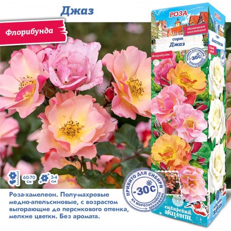 Роза флорибунда «Джаз» — идеальный сорт для групповых посадок, который привлекает внимание невероятной игрой красок, напоминающей жидкую палитру художника. Её цветки, меняющие оттенок по мере роспуска от медно-оранжевого до нежного персикового, создают на одном кусте потрясающее многоцветье розовых, коралловых, жёлтых и оранжевых тонов. Обильное и продолжительное цветение обеспечивает постоянную декоративность, а даже полностью раскрывшиеся цветки с золотистыми тычинками сохраняют свою привлекательность и не выглядят растрёпанными.