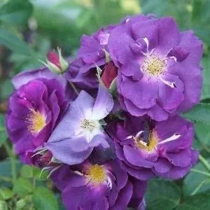 Роза парковая «Рапсоди ин Блю» привлекает внимание уникальным насыщенным окрасом, где в каждом полумахровом цветке диаметром 5-6 см сочетаются глубокие тона от пурпурного до фиолетово-лилового и синего. Её цветы собраны в изящные кисти по 3-7 бутонов и обладают выразительным сладко-пряным ароматом.