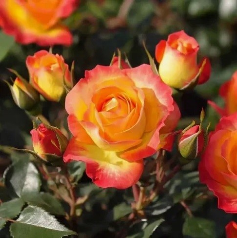 Роза «Тайфун» представляет собой эффектный спрей-сорт, главной особенностью которого являются пышные соцветия на каждом побеге, напоминающие готовые миниатюрные букеты. Куст высотой около 60 см обладает декоративной серебристо-зеленой листвой с легким блеском и почти не имеет шипов. Небольшие, изящные бутоны диаметром 4–6 см, состоящие из примерно 35 лепестков, отличаются необычным многоцветным окрасом, где плавно сочетаются оттенки оранжевого, розового и желтого. Сорт радует продолжительным и обильным цветением с начала лета до середины осени, наполняя сад тонким, свежим ароматом. Благодаря своей яркой, жизнерадостной красоте «Тайфун» станет выразительным акцентом в любом ландшафте или запоминающимся подарком, символизирующим энергию и гармонию природы