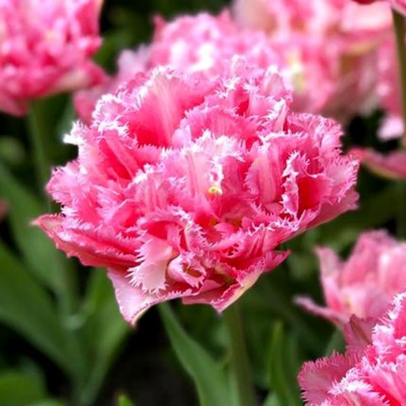 Размер луковицы 11-12 см Тюльпан Криспион Свит (Crispion Sweet). Класс- дабл-махромчатые Тюльпан Криспион Свит относится к бахромчатым сортам (класс FR). Цветет тюльпан Криспион Свит в конце мая, образуя насыщенно-розовый цветок, с белыми всполохами и изящной бахромой на кончиках лепестков, высота бокала 8-9 см диаметр 9-15 см. Отличительная особенность этих тюльпанов - игольчатая бахрома по краям лепестков, напоминающая иней. Как бы то ни было, бахромчатые тюльпаны всегда производят неизгладимое впечатление. Обладает тюльпан Криспион Свит средней скоростью роста, подходит как для озеленения и украшения клумб, так и для букетов. Красивый насыщенно-розовый цветок возвышается на прочной ноге высотой 30-35 см. Легко размножается, дает прекрасную срезку