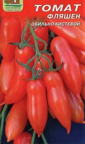 Томат 'Фляшен' – раннеспелый, индетерминантный сорт, подходящий для выращивания как в закрытом, так и в открытом грунте. Характеризуется раскидистым типом роста и узкими листьями. Плоды имеют удлиненно-овальную форму с небольшим носиком, ярко-красный цвет и глянцевый блеск, вес 60-80 г. Внутри содержат две-три камеры. Отличаются сладким, насыщенным томатным вкусом. Формирует обильные кисти, содержащие 20 и более плодов. Благодаря обилию многоплодных кистей, сорт демонстрирует высокую урожайность