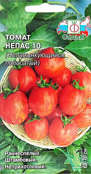 Раннеспелый сорт «Непас 10» созревает за 95-100 дней и предназначен для выращивания в открытом грунте или под временным плёночным укрытием. Главная особенность растения — его детерминантный, штамбовый куст высотой 60-70 см, генетически предрасположенный к минимальному образованию пасынков, что делает процедуру пасынкования необязательной. Благодаря компактности, ранним срокам созревания и разреженной листве, посадки хорошо проветриваются, что снижает риск распространения фитофтороза.