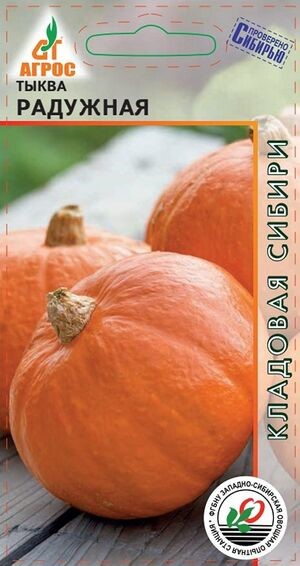 "Радужная" – сорт тыквы сибирской селекции, характеризующийся средней спелостью и высокой урожайностью. Растение плетистое. Плоды округлые, порционные, массой 2,5-3,5 кг, с привлекательной оранжевой окраской. Кора тонкая, но достаточно прочная. Оранжевая мякоть, толщиной 3-4 см, обладает высокими вкусовыми качествами и сладостью. Сорт сохраняет свои качества в течение 6-7 месяцев хранения. "Радужная" используется как в свежем виде, так и для переработки на соки, пюре и цукаты. Ценность сорта заключается в сладкой, вкусной мякоти и длительном хранении без потери вкусовых качеств.