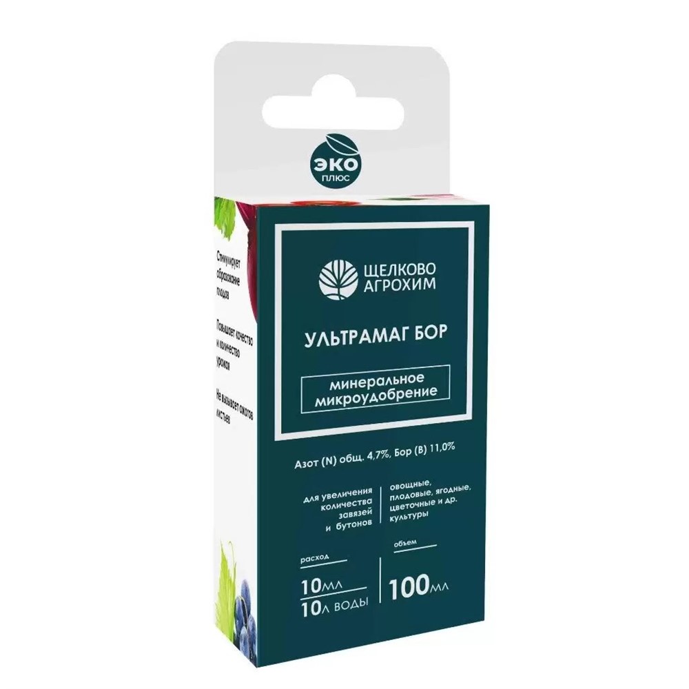"Ультрамаг БОР" – минеральное удобрение, способствующее увеличению числа завязей и бутонов на овощных, плодово-ягодных и декоративных культурах.